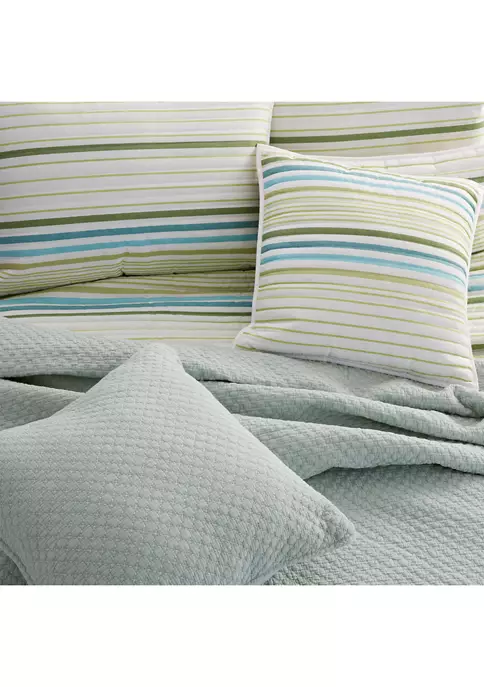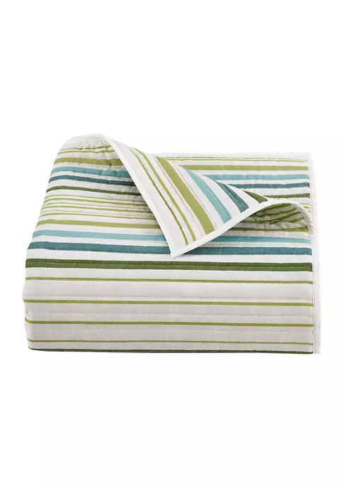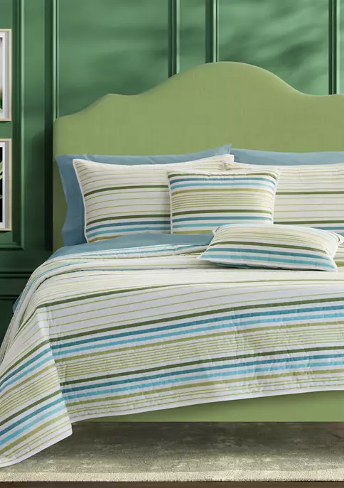 The Roxanne Quilt offers a charming vintage look to your sleep space with a classic coastal stripe design. Printed on soft 100% cotton with an all-seasons construction for amplified comfort, this sleek quilt will add a refreshed look to any bedroom. The quilt features a calming aquamarine palette of teals and greens, for a modernized classic feel. Add the Roxanne throw pillows and shams to complete the look.
