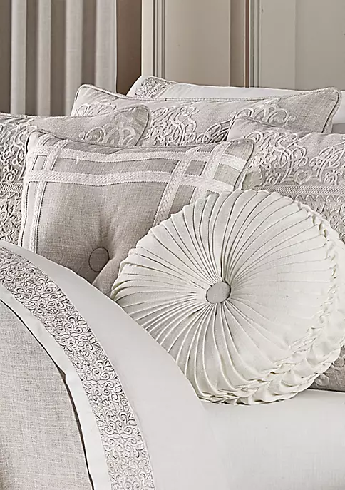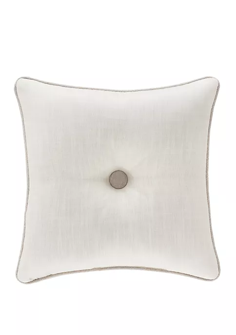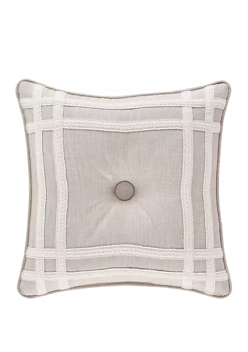 The 18-inch Lauralynn decorative pillow from J Queen New York has 2 rows of cream-colored gimp on the beige-colored faux linen face. Added 0.25-inch beige-colored piping finishes the pillow.