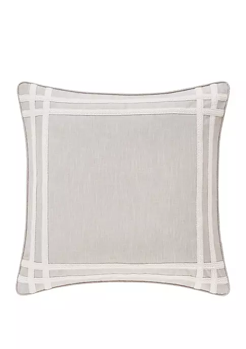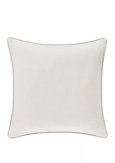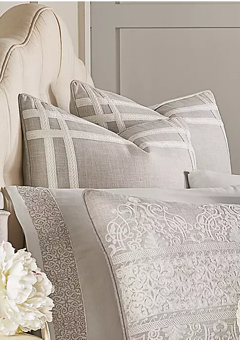 The Lauralynn euro sham from J Queen New York has 2 rows of cream-colored gimp topstitched on a beige colored faux linen and a solid reverse.