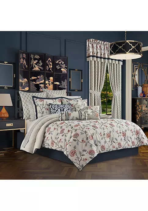 The Parkview Collection 4 Piece Comforter Set is beautifully designed, combining a lush floral embroidery with layers of color throughout the leaves and vines of this unique embroidery. The colors are a fresh shade of coral, blush, taupes, and navy blue. The embroidery design sits on top of a textured natural color linen base fabric. The set includes a embroidered comforter showing off lush embroidery and lots of extra details, including a navy cord all around . The Pillow Shams are constructed with coordinating embroidery and finished with a navy textured flange. Also included is the tailored bedskirt which adds the finishing touch with a solid navy linen texture.