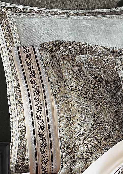 The Euro sham has the solid Stone Chenille fabric centered on the sham, bordered by the coordinating Chenille scroll stripe, mitered at the edges. The sham reverses to the coordinating chenille foulard fabric. The fine details include a hidden zipper and are finished with a chenille foulard 0.25-in. piping.