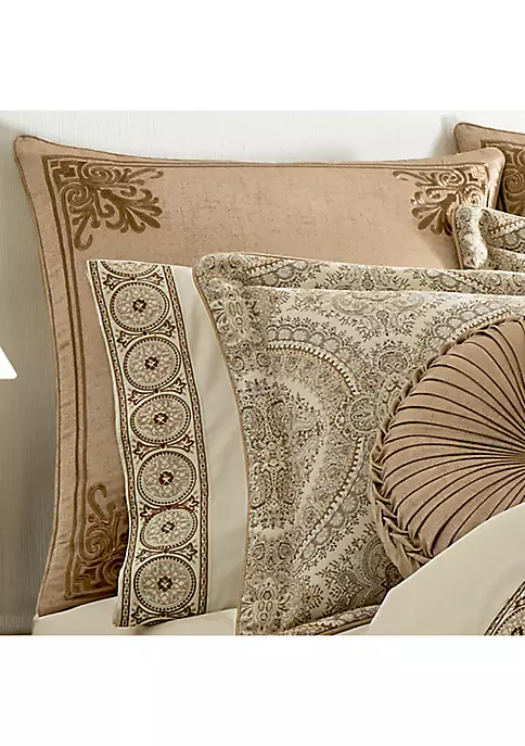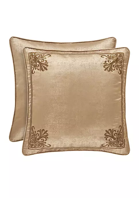 This Euro sham pillow is designed with intricate embroidery in four corners of the gold woven textured face and piping in solid gold to finish the pillow.